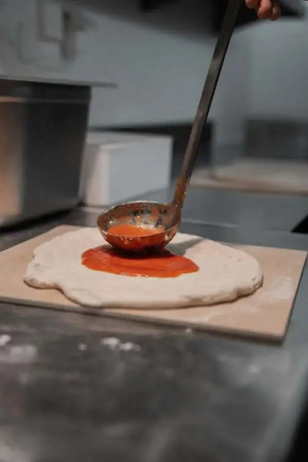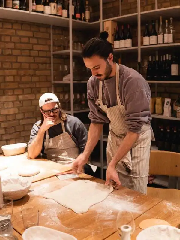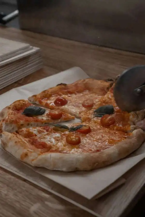 Biomehl, sonnenverwöhnte Biotomaten, Fiore di Latte Mozzarella, frische Beläge vom Markt und von der Schneidermaschine.
